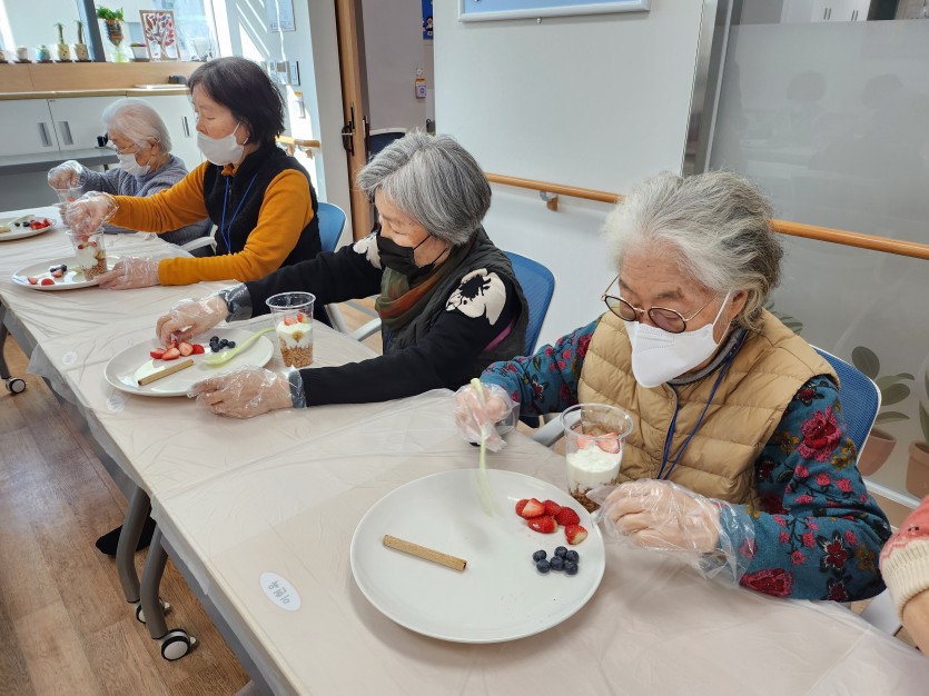 요리교실 시간에 요거트를 이용하여  파르페를 만들어 간식으로 드셨습니다.